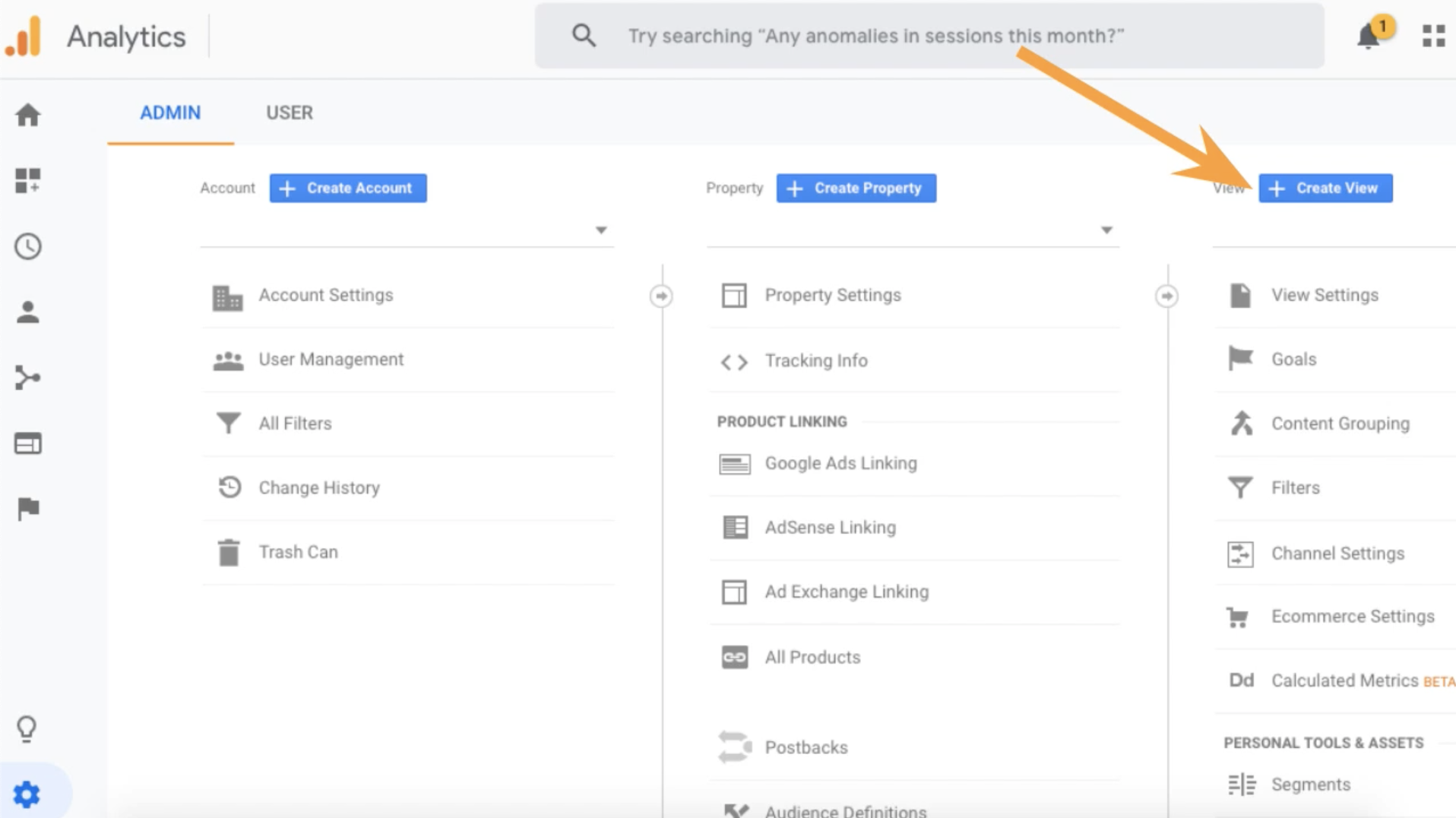 - In GA admin, click “Create View”