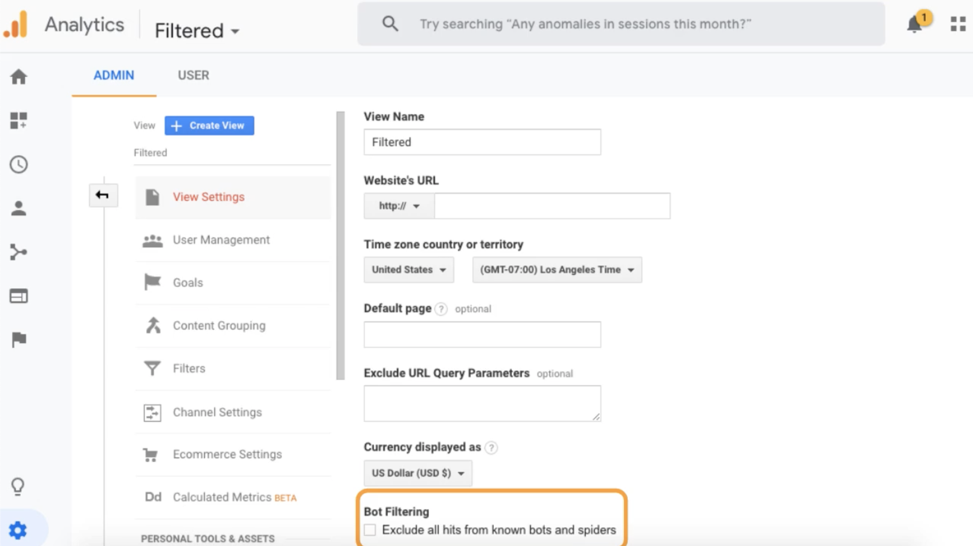 - Filtered view > View Settings > Bot Filtering > check “Exclude all hits from known bots and spiders