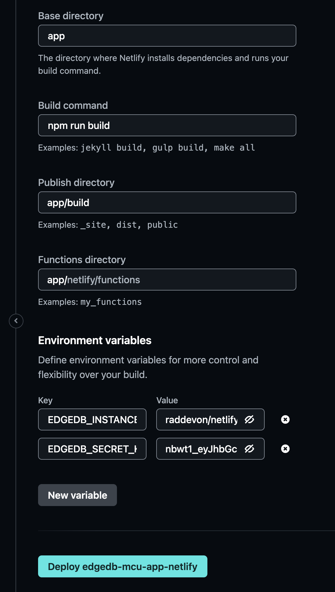 Note: This guide assumes the Git deployment method on Netlify, but you may also deploy your site using other methods. Just make sure the EdgeDB Cloud environment variables are set, and your app should have connectivity to your instance.