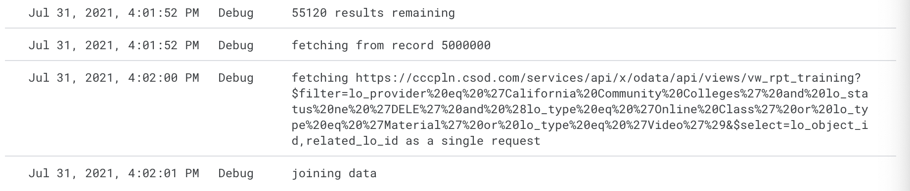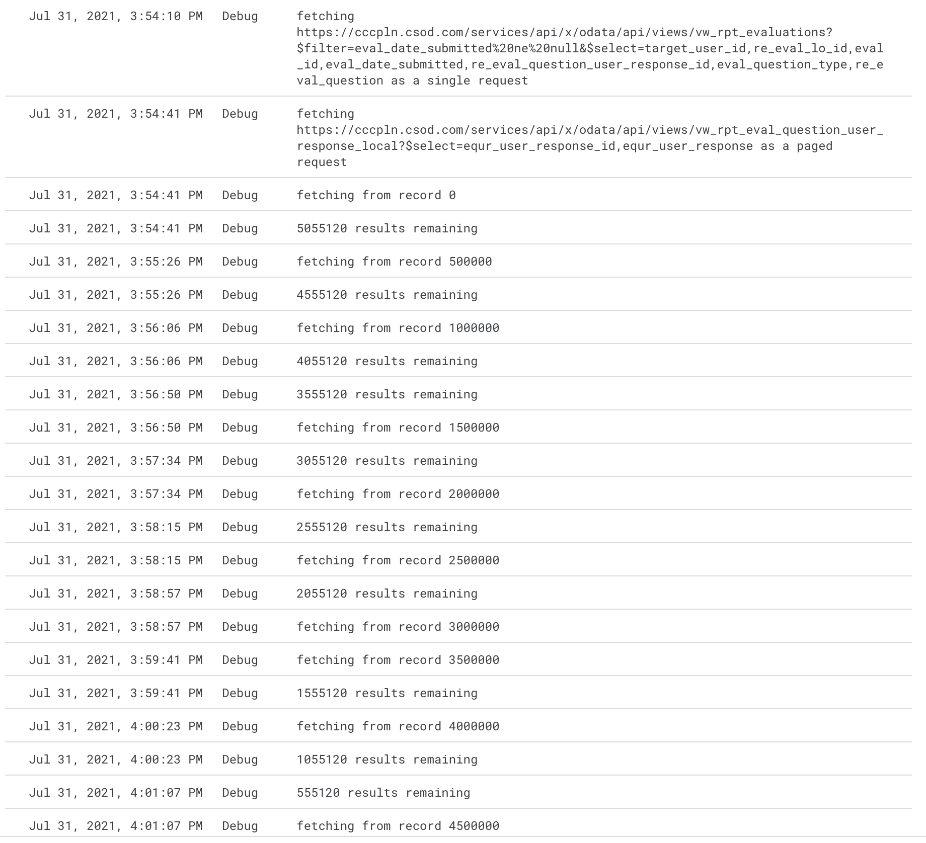 Continued working on getting the evaluation responses connector to work. It’s timing out because there are so many records. I added some logging and learned that it’s timing out before it even finishes de-duplicating. I had done some optimizations on the join algorithm, but we didn’t even get that far before timing out.